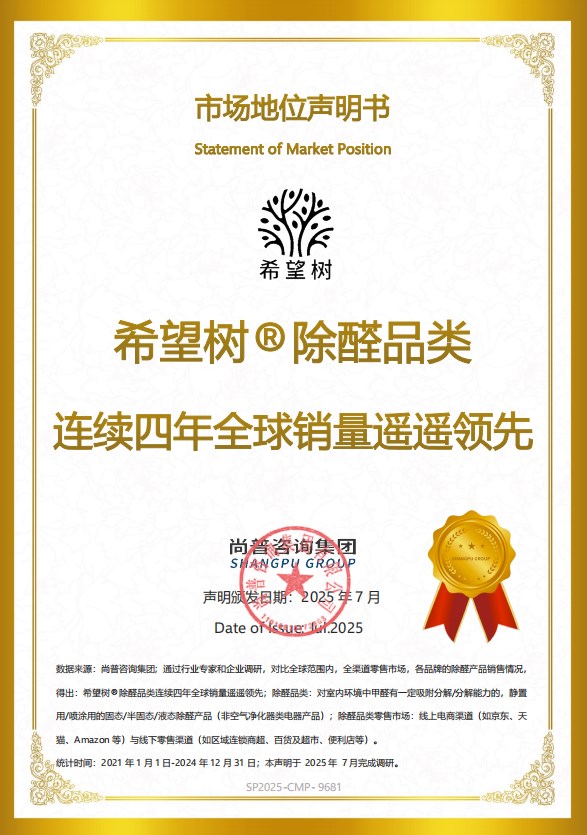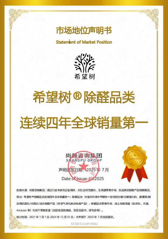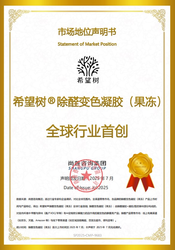 —— 除醛品类连续四年全球销量第一、除醛品类连续四年全球销量遥遥领先、除醛凝胶全球行业首创、1100W用户选择希望树、清华大学报告建筑检测中心报告、除甲醛报告、除TVOC报告、除甲苯报告、除二甲苯报告、皮肤不致敏、经口无毒。